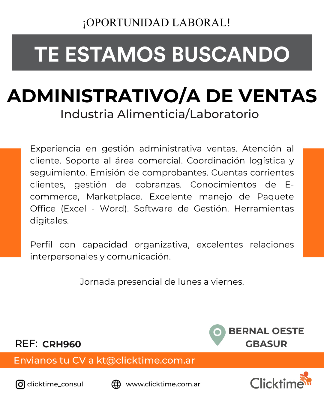 ¡Hola! estamos acompañando a nuestro cliente en la búsqueda de un/a Administrativo/a de Ventas, para sumar a su equipo de trabajo, Pyme de la Industria Laboratorio/Alimenticia, especializada en nutrición y fitness en zona Bernal Oeste – GBASUR. Si sos una persona con capacidad organizativa, excelente comunicación, orientación al cliente, manejo de herramientas informáticas, que pueda brindar soporte al área comercial y colaborar en la gestión integral del proceso de ventas, esta oportunidad puede ser para vos.