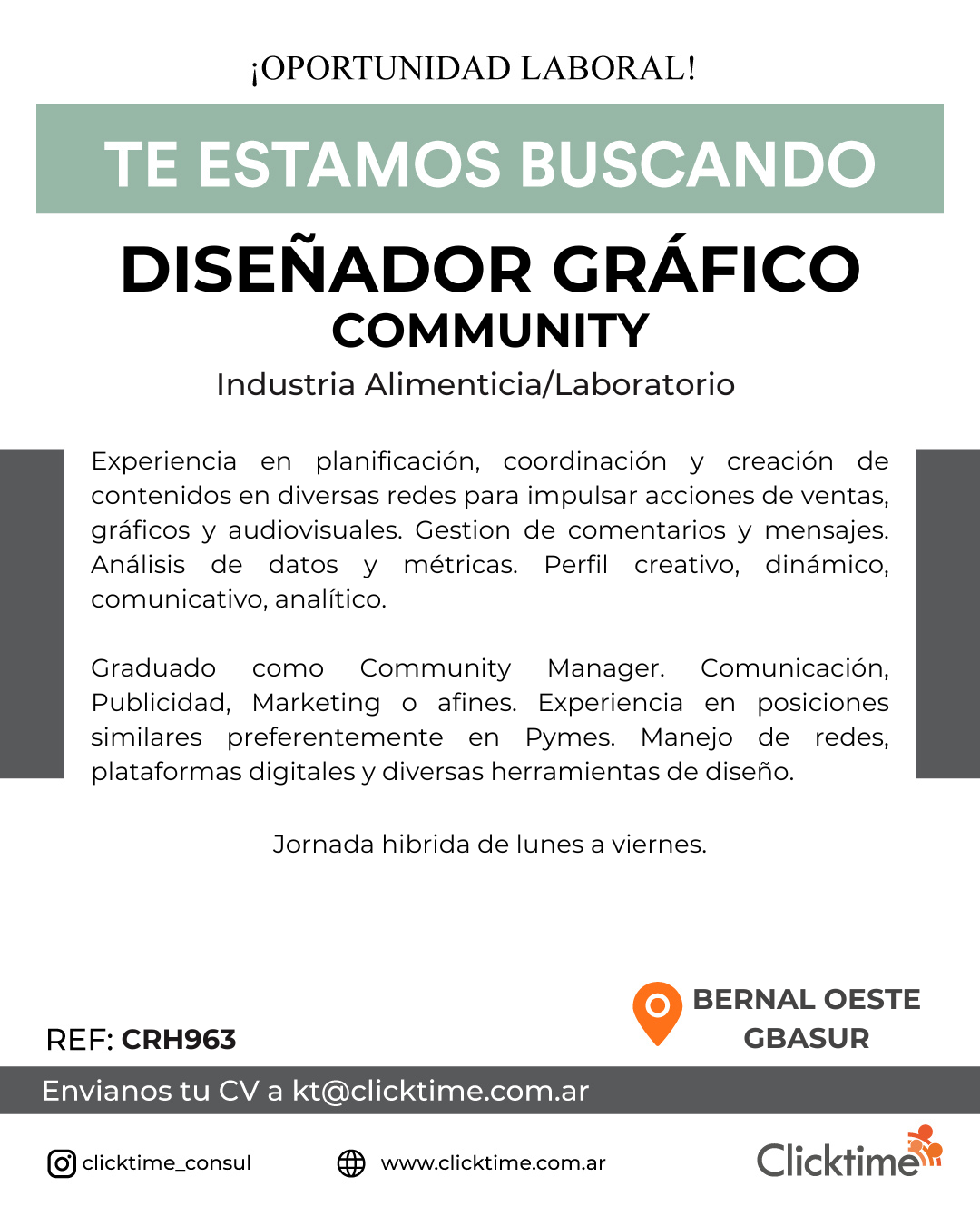 ¿Te apasionan las redes, sos una persona creativa, con buen ojo para el diseño, sensibilidad para la comunicación, con diversos conocimientos digitales y análisis de resultados? Esta oportunidad es para vos. Seleccionamos Diseñador Gráfico/ Community Manager para nuestro cliente PYME de la Industria Laboratorio/Alimenticia, especializada en nutrición y fitness en pleno crecimiento ubicada en Zona Bernal Oeste (GBASUR).